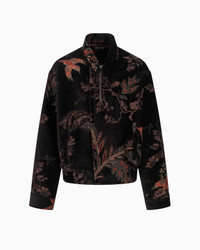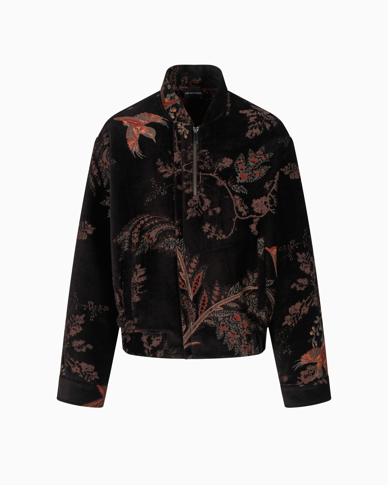 Blouson with an off-centre fastening and partial-zip collar, made of exquisite damask chenille. This piece is embellished with a chinoiserie motif that enhances its sophisticated texture, adding a touch of elegance to the style. The keyword for the Emporio Armani FW25 men’s selection is seduction, a subtle art expressed through words, gestures and styles that take inspiration from refined settings such as lounges, clubs or private circles where a relaxed and sophisticated mood flows. The textures, with their rich, tactile and vibrant finishes, also reflect the spirit of these places, recalling brocades and tapestries adorning interiors with a subdued, sophisticated lustre. Damask chenille Chinoiserie motif Collar with half-zip closure Off-centre closure Long sleeves Side pockets Gathered hem Product Code: EM004114AF21003F7057