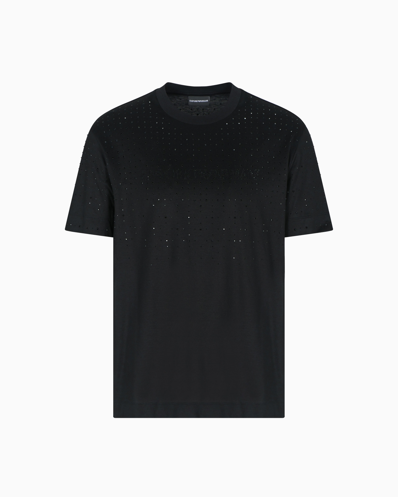 Crew-neck T-shirt embellished with a matching heat-sealed rhinestone logo applied on the front and back. Made from a cotton and Lyocell blend jersey. This item belongs to the Clubwear capsule collection, a selection of casual styles with added distinction and shimmer, designed to shine on the most special evening events, at parties and in clubs. The palette is entirely black, embellished with sparkling details and matching rhinestones that give a vibrant, glistening allure. Jersey Crew neck Short sleeves Heat-sealed rhinestones Front logo Product Code: EM003676AF10761UC001