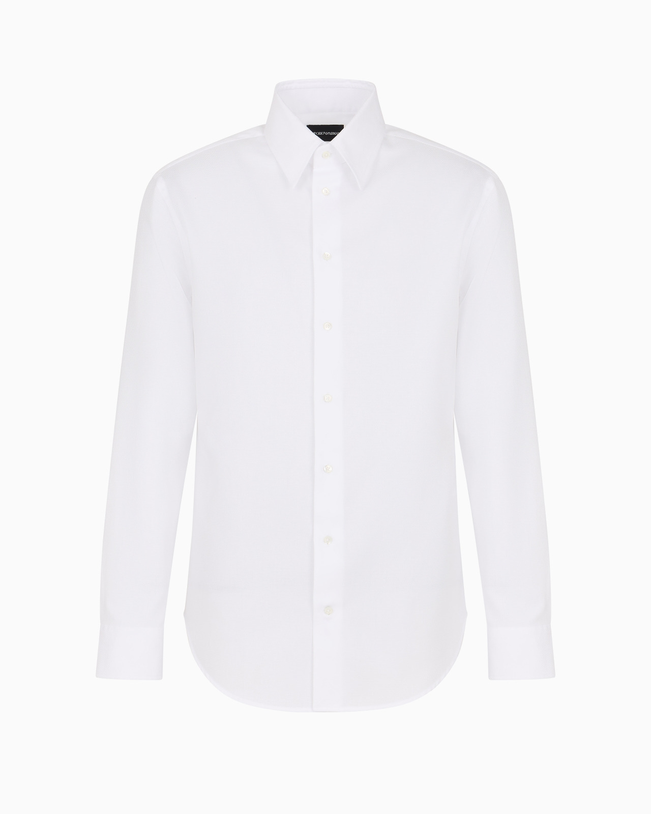 Pure cotton shirt with classic collar. The armure weave creates a two-tone micro-pattern that extends over the entire garment. Product Code: EM000194TE109551U0002 Details Composition 100% Cotton Armure weave Classic collar Front buttoning Long sleeves Rounded cuffs Back yoke Fitting The model is 188 cm tall and is wearing size 40