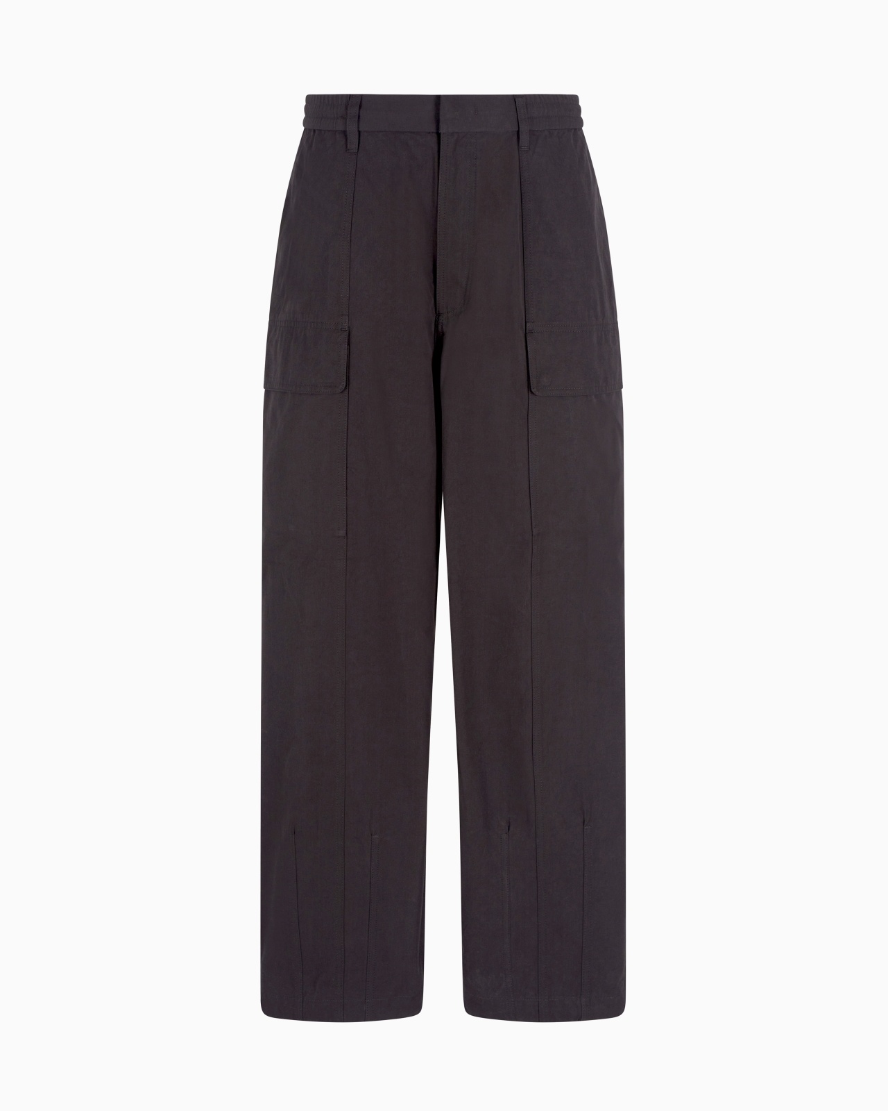 Cargo-style trousers with large side patch pockets with flap. The garment’s fabric, made from a cotton blend with a small percentage of silk, is particularly thick and resistant to the touch. Elasticated waist Inner drawstring Closure with zip, hook and back button Side pockets Large patch pockets with flap Back double welt pockets Product Code: EM001144AF13807U8168