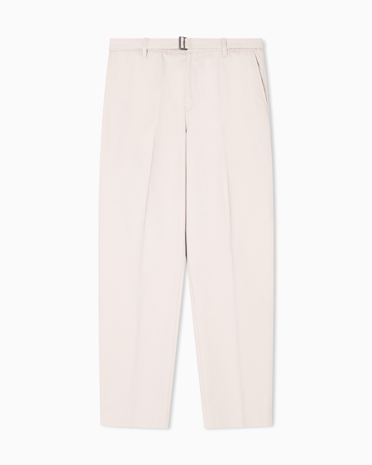 Trousers with a matching belt at the waist. The garment’s fabric, made from a cotton blend with a small percentage of silk, is particularly thick and resistant to the touch. Waist with belt loops Matching belt Zip and button closure Side pockets Buttoned back welt pockets EA logo plate Product Code: EM003801AF13807U1156