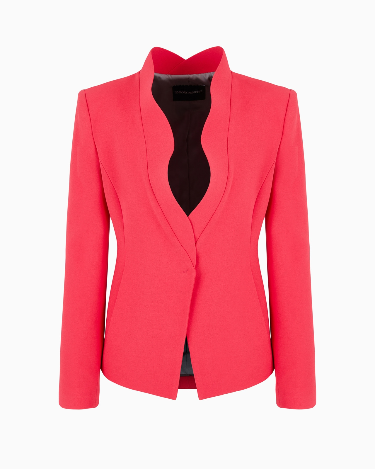 This women’s jacket fully represents Emporio Armani style: the contoured edges of the ruffle-effect lapels, with internal crinoline that ensures structure, give it a sophisticated and particularly chic style. The crepe cady fabric glides over the silhouette to enhance the wearer’s femininity. Product Code: EW000258TE104181U4169 Details Composition 50% Viscose 47% Acetate 3% Elastane Cady crepe Single-breasted Lapels with shaped edges and crinoline Concealed press-stud closure Long sleeves Satin lining Fitting The model is 178 cm tall and is wearing size 40/S (Italian Size)