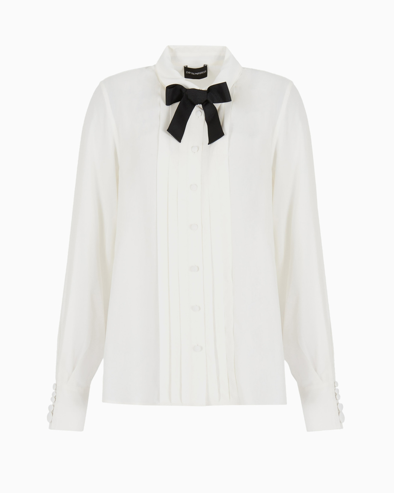 Shirt with a classic collar made of viscose crepe which, thanks to its natural transparency and lightness, is an ultra feminine piece that will add a touch of luxury to any outfit. Pleated detail along the placket and grosgrain bow that can be removed through a press stud. Product Code: 6R2C632NP2Z10101 Details Composition 100% Viscose Viscose crepe Classic collar Removable bow Front buttoning Covered buttons Pleated placket trim Long sleeves Cuffs with five buttons Fitting The model is 178 cm tall and is wearing size 40/S (Italian Size)