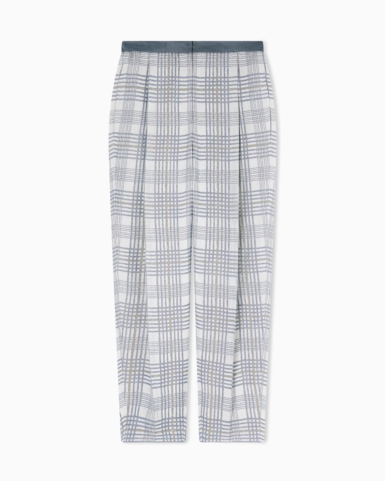 Trousers with darts at the waist that create deep front pleats. The piece is made of pure viscose jacquard with an all-over check motif, embellished with threads that give the texture a slightly iridescent effect. Jacquard Check motif Ottoman waistband Darts with pleat Fastening with zip, press stud and back button Canvas side pockets Unlined garment Product Code: EW003520TE13524F8023