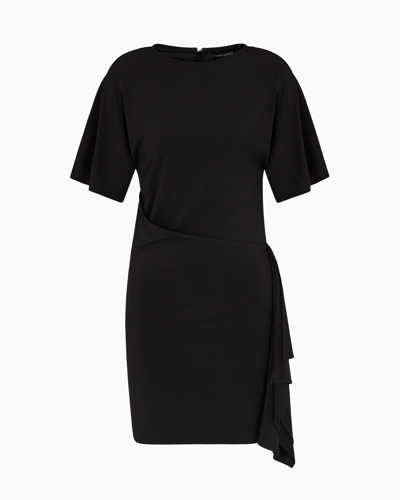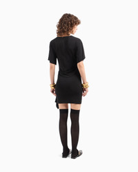 Short-sleeved round-neck dress made from stretch jersey. The style is distinguished by its flounced panel skirt, which creates a unique side drape that enhances the sophisticated character of the garment. The style is part of this season’s new Dawn to Dusk capsule collection, a selection of wardrobe essentials in a colour palette that takes inspiration from the golden light of dawn and the subtle shadows of sunset, creating a mix of warm and sophisticated tones accompanied by darker touches of shade. A line designed to create a versatile wardrobe with pieces that lend themselves to being worn together to create layered looks, or matched to produce different creations that accompany you from morning to night. Jersey Rounded neckline Short sleeves Side flounce Unlined garment Product Code: EW001757AF15394UC001