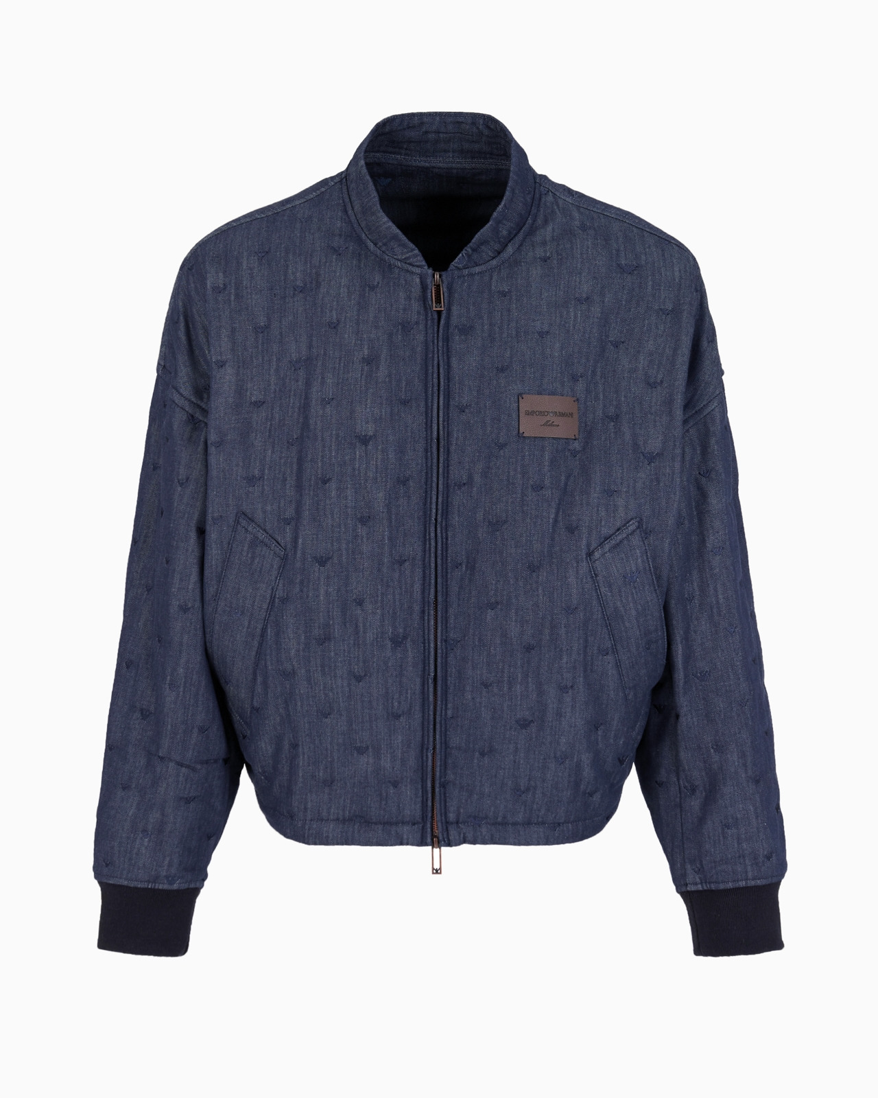 Jacket with zip fastening, made of pure-cotton denim and embellished with iconic micro-eagle embroidery all over. Denim stands out as an urban fabric, conveying workwear style while maintaining a casual, adventurous spirit. The interior of the piece replicates the pattern on the exterior with micro-eagle embroidery for another exclusive touch. Product Code: 6D1BD51DTXZ10904 Details Composition 100% Cotton Denim Lightweight interior padding All-over micro-eagle embroidery Zip closure Front logo patch Side pockets with press studs Long sleeves Rib-knit cuffs