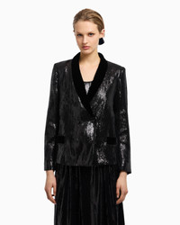 Double-breasted blazer with shawl lapels, entirely encrusted with bright sequins. The style is embellished with velvet details used for the lapels and pockets. A piece to let you shine on the most special occasions. All-over sequins Double-breasted Neckline with velvet shawl lapels Long sleeves Button cuffs Velvet side pockets Slit at the back Satin lining Product Code: EW001352AF14321UC001