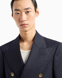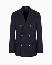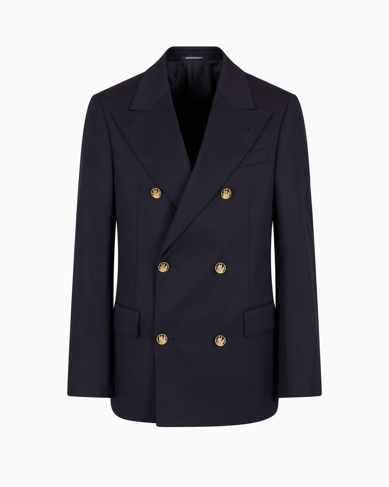 Double-breasted jacket in a pure virgin-wool double cover fabric, a lightweight, soft and durable fabric with a typical diagonal weave. The exquisite gold-tone buttons are detailed with a solid-void screen print depicting a sailing ship, symbolising the Atlantic theme and highlighting the garment with refined highlights. Cover fabric Double-breasted Buttoned fastening Long sleeves Button cuffs Gold-tone screen-printed buttons Side welt pockets with flap Lined garment Three inner welt pockets Product Code: EM000290TE11229UB109