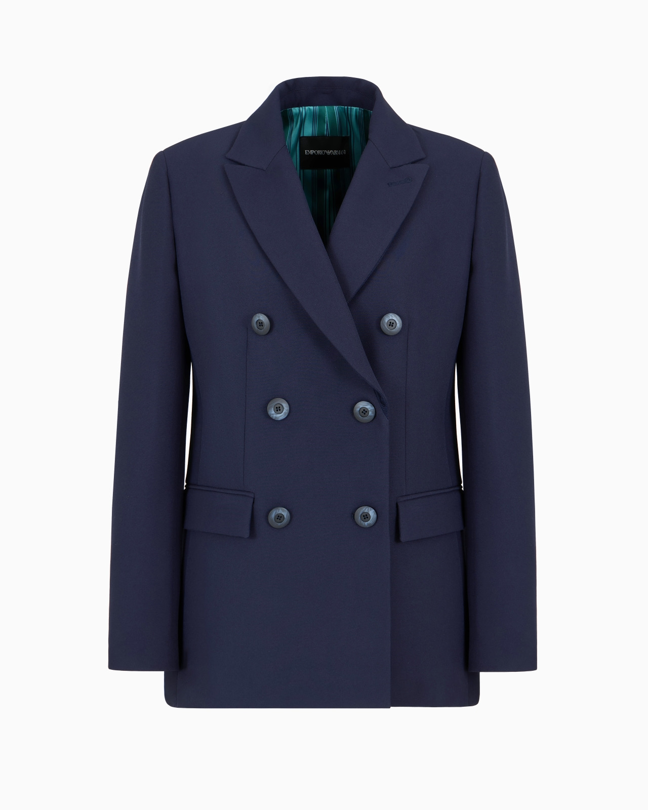 Double-breasted jacket with wide lapel collar, made of stretch sable technical fabric. Thanks to a classic, straight cut, this jacket can be worn everywhere, making it perfect on every occasion, from mornings at the office to after-work drinks. Product Code: EW000087TE111931UB108 Details Composition 92% Polyester 8% Elastane Stretch sable technical fabric Double-breasted Lapel collar Side welt pockets with flap Long sleeves Single-buttoned cuffs Two back vents Ottoman interior facing and details Satin lining with striped print Fitting The model is 178 cm tall and is wearing size 40/S (Italian Size)