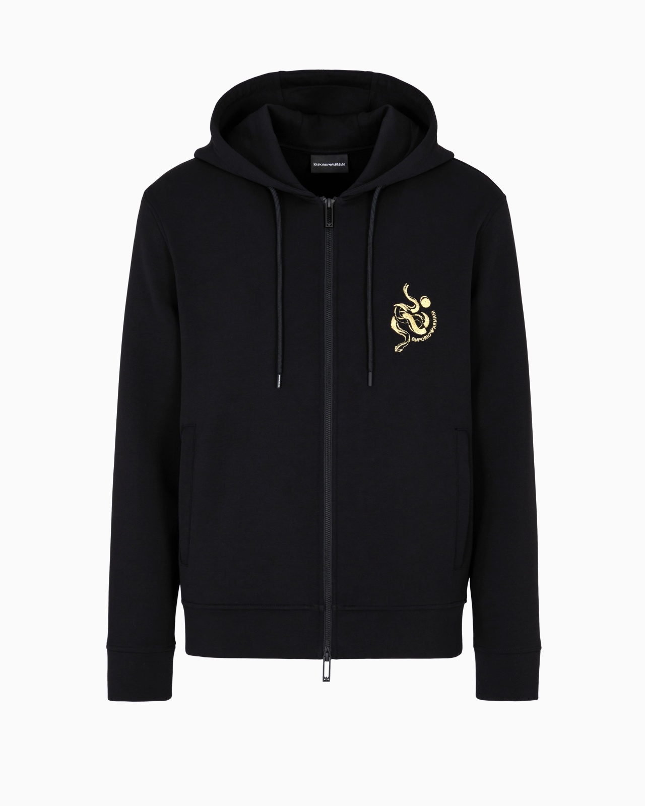 Cotton double jersey men’s sweatshirt with front zip, drawstring hood and collection snake embroidery. The item belongs to the Lunar New Year capsule collection, whose standout feature is the snake, a symbol of wisdom, stability and intuition. Tradition and superstition merge with the roots of East Asia, creating auspicious influences and symbols, characterised by luxurious embroidery on a black and red background, brightened with luminous touches of gold. Double jersey Drawstring hood Long sleeves Zip closure Side pockets Collection embroidery Product Code: EM001699AF10013UC001