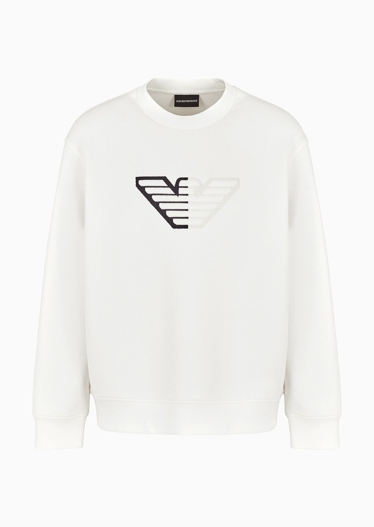 Regular-fit crew-neck sweatshirt in soft cotton-blend double jersey. The two-toned, super-embossed oversized eagle is created on an embroidered base that follows chevron motif to highlight the eagle’s profile. Product Code: 6D1M761JHSZ10101 Details Composition 76% Cotton 18% Polyester 6% Elastane Regular fit Double jersey Crew neck Long sleeves Elasticated trim Oversized, two-tone eagle Fitting Regular fit The model is 188 cm tall and is wearing size 48/M (Italian Size)