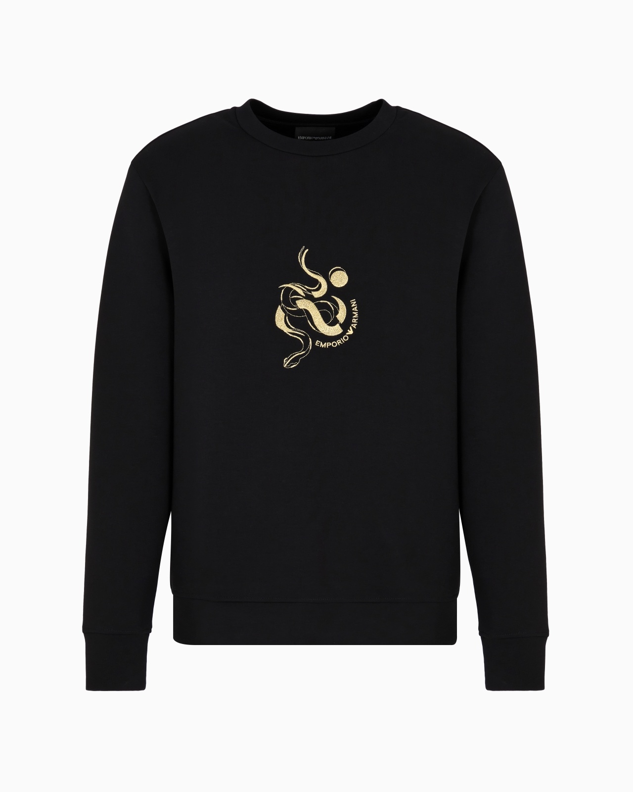 Cotton double jersey men’s crew-neck sweatshirt with collection embroidery. The item belongs to the Lunar New Year capsule collection, whose standout feature is the snake, a symbol of wisdom, stability and intuition. Tradition and superstition merge with the roots of East Asia, creating auspicious influences and symbols, characterised by luxurious embroidery on a black and red background, brightened with luminous touches of gold. Double jersey Crew neck Long sleeves Collection embroidery Product Code: EM001700AF10013MC185