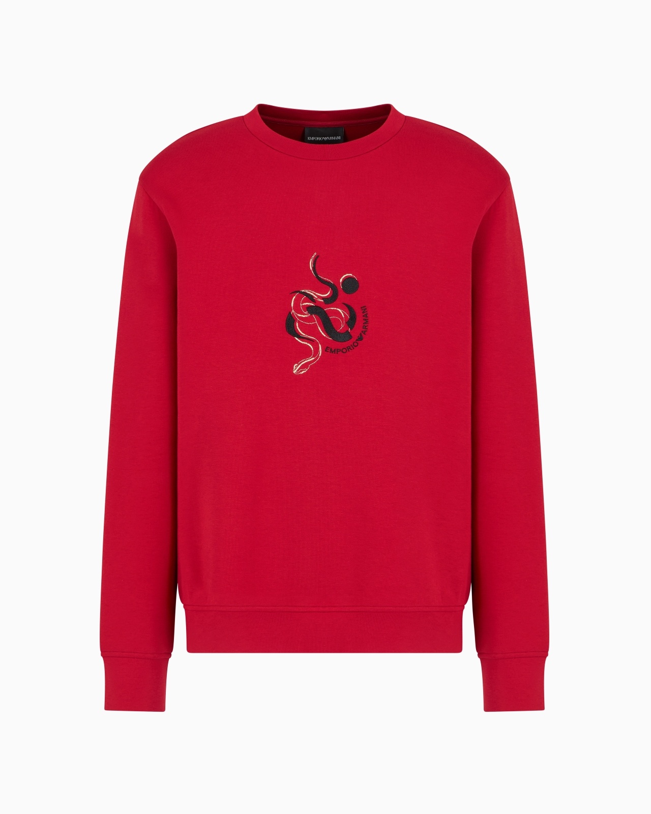 Cotton double jersey men’s crew-neck sweatshirt with collection embroidery. The item belongs to the Lunar New Year capsule collection, whose standout feature is the snake, a symbol of wisdom, stability and intuition. Tradition and superstition merge with the roots of East Asia, creating auspicious influences and symbols, characterised by luxurious embroidery on a black and red background, brightened with luminous touches of gold. Double jersey Crew neck Long sleeves Collection embroidery Product Code: EM001700AF10013M5039