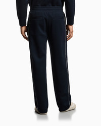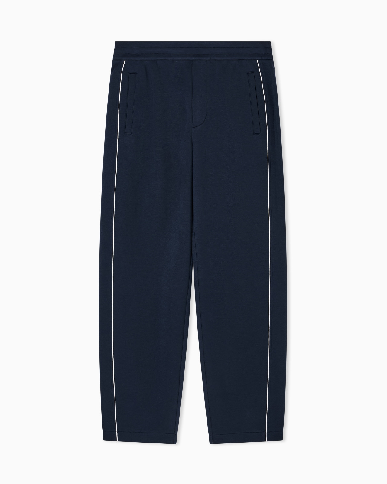 Elasticated-waist trousers with internal drawstring, featuring decorative piping on the sides and made of cosy 100% modal double jersey. The metal EA logo plate on the back completes the piece with understated elegance. Double jersey Elasticated waist Inner drawstring Concealed zip fly Side welt pockets Decorative piping Back welt pockets EA logo plate Product Code: EM002886AF17545UB118