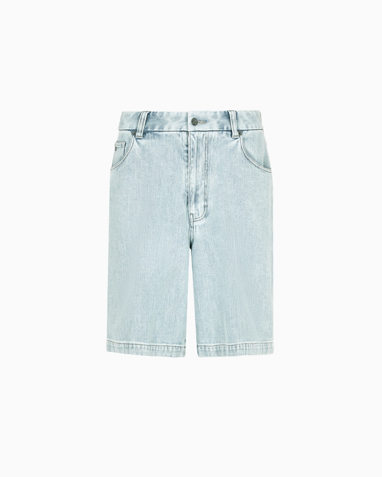 Five-pocket Bermuda shorts with matching belt at the waist. The garment is made of dobby fabric: a loom-woven canvas featuring small geometric motifs that, in this case, create a unique, armure micro pattern that gives the weave an elegant denim effect. This season denim is elevated to become an expression of smarter, more refined casualwear: the fabrics are lighter in weight and washes are more subtle, thanks to perfected natural bleaching blends and treatments. Dobby fabric Five-pocket style Waist with belt loops Coordinated belt included Zip and button closure Leather logo patch Product Code: EM001747AF13443MB003