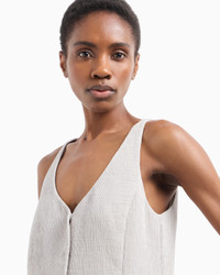 Single-breasted V-neck waistcoat. The style has a weave formed of dense, embossed, all-over ribbing that is typical of cannete fabric. Fluid cannete V neck Single-breasted Front press-stud closure Sleeveless Lined garment Product Code: EW000870AF12523U8036