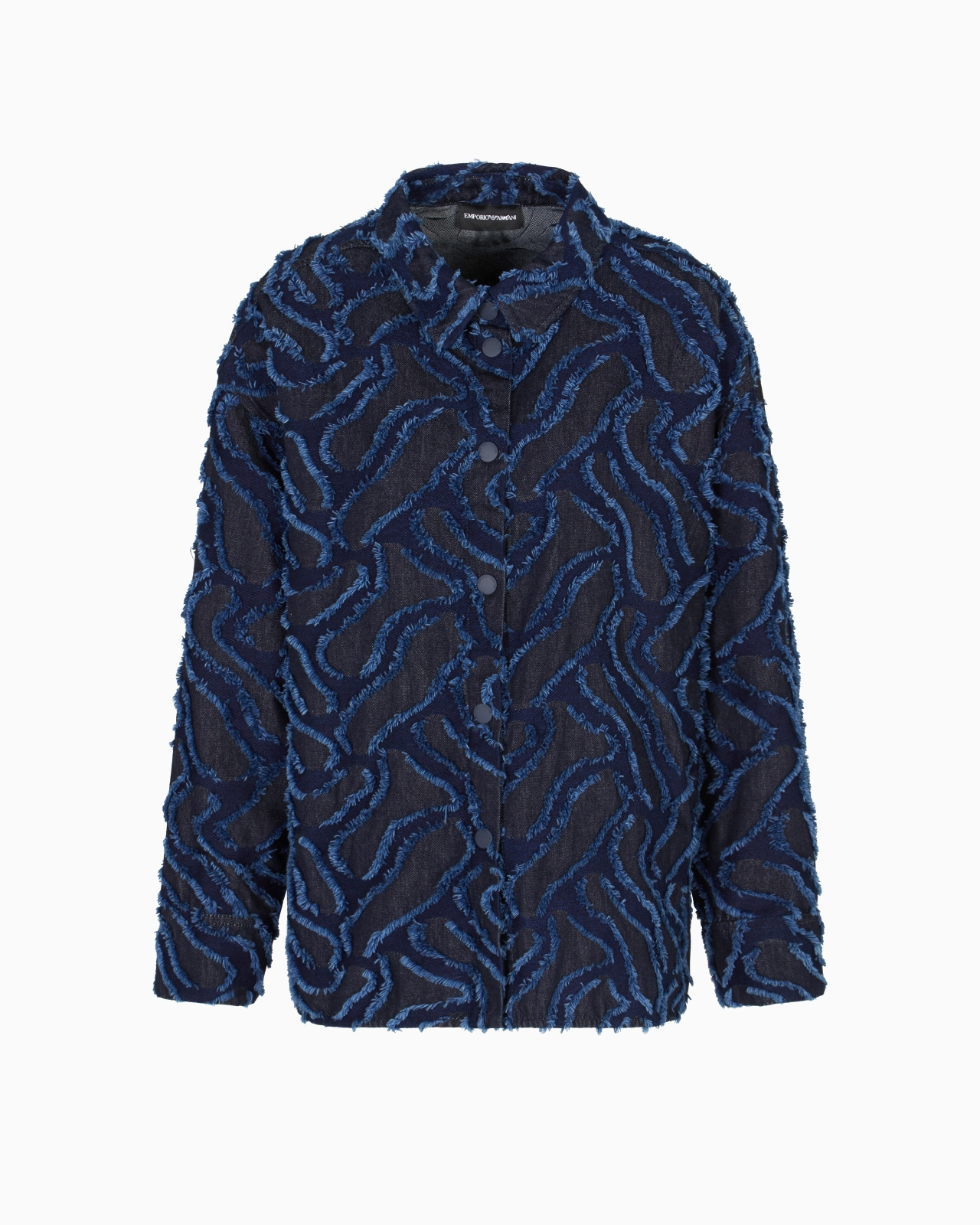 Denim shirt jacket with front buttoning with press studs. The style is embellished with a refined fringed embossed motif created by an all-over jacquard giving the piece a textured, original look. Denim Jacquard Fringed embossed motif Classic collar Press-stud closure Long sleeves Side slits Product Code: EW002062AF16425FB119