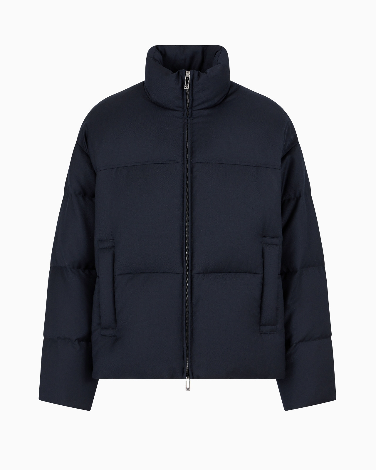 Down jacket with a zip fastening, made of a wool-blend twill fabric with a texture defined by a signature all-over diagonal weave. The snug fit from the genuine down filling is enhanced by the quilting. Wool-blend twill Mock neck Full zip Long sleeves Side pockets with zip Two inside pockets with zip Lined garment Product Code: 6D1BB31NVCZ0920