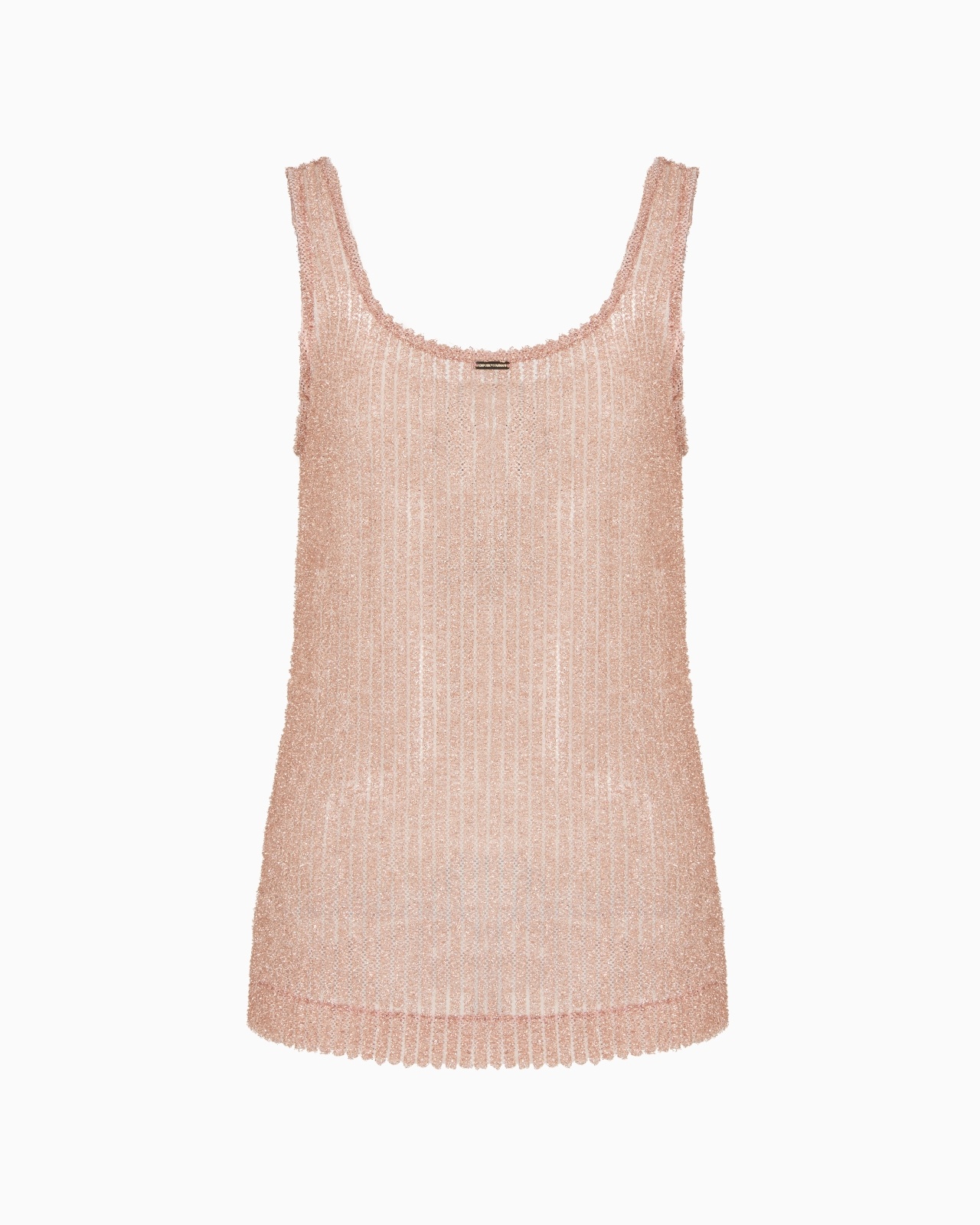 Bold scoop neck tank top. The style features a ribbed fuzzy lurex fabric that creates a 3D effect and adds a touch of sparkle. Lurex Fuzzy ribbed fabric Rounded neckline Metal logo plate Product Code: EW000565AF12204U4115