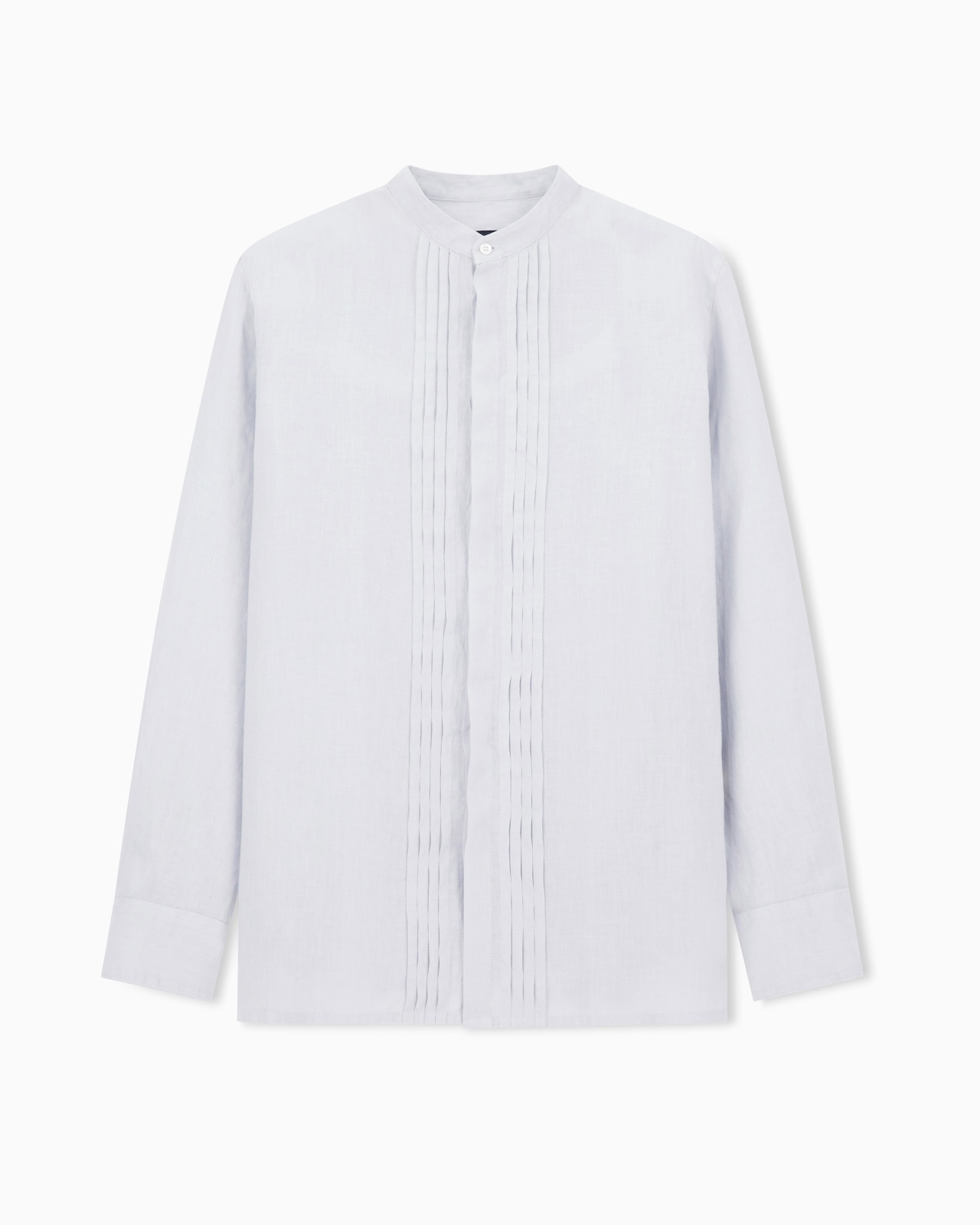 Shirt with guru collar and decorative pleated detail that follows the outline of the concealed button placket. Made from garment-dyed 100% linen. This shirt’s clean lines are harmoniously enhanced by fresh, high-quality linen which, thanks to the garment-dyed treatment, takes on a slightly "crinkled" effect and becomes of the summer season’s wardrobe must-haves by right. Linen Garment dyed Guru collar Long sleeves Front buttoning Pleated details Rounded cuffs with button Back yoke Product Code: EM003016AF15799U8017