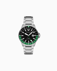 This 42mm watch features a black enamel dial, GMT dual time movement and stainless steel bracelet. Movement: Quartz/Dual Time Dial: Black Case size: 42mm Case material: Stainless Steel Plating: Silver Strap/bracelet: Silver, Stainless Steel 10 ATM Product Code: AR11589NLPNLC