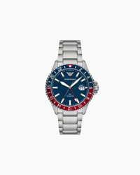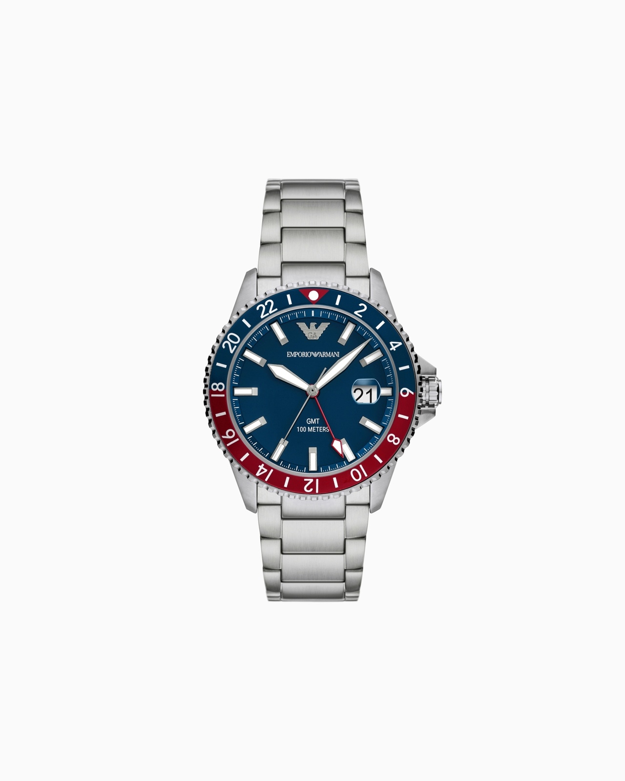 This 42mm watch features a dark blue enamel dial, GMT dual time movement and stainless steel bracelet. Movement: Quartz/Dual Time Dial: Blue Case size: 42mm Case material: Stainless Steel Plating: Silver Strap/bracelet: Silver, Stainless Steel 10 ATM Product Code: AR11590NLPNLC