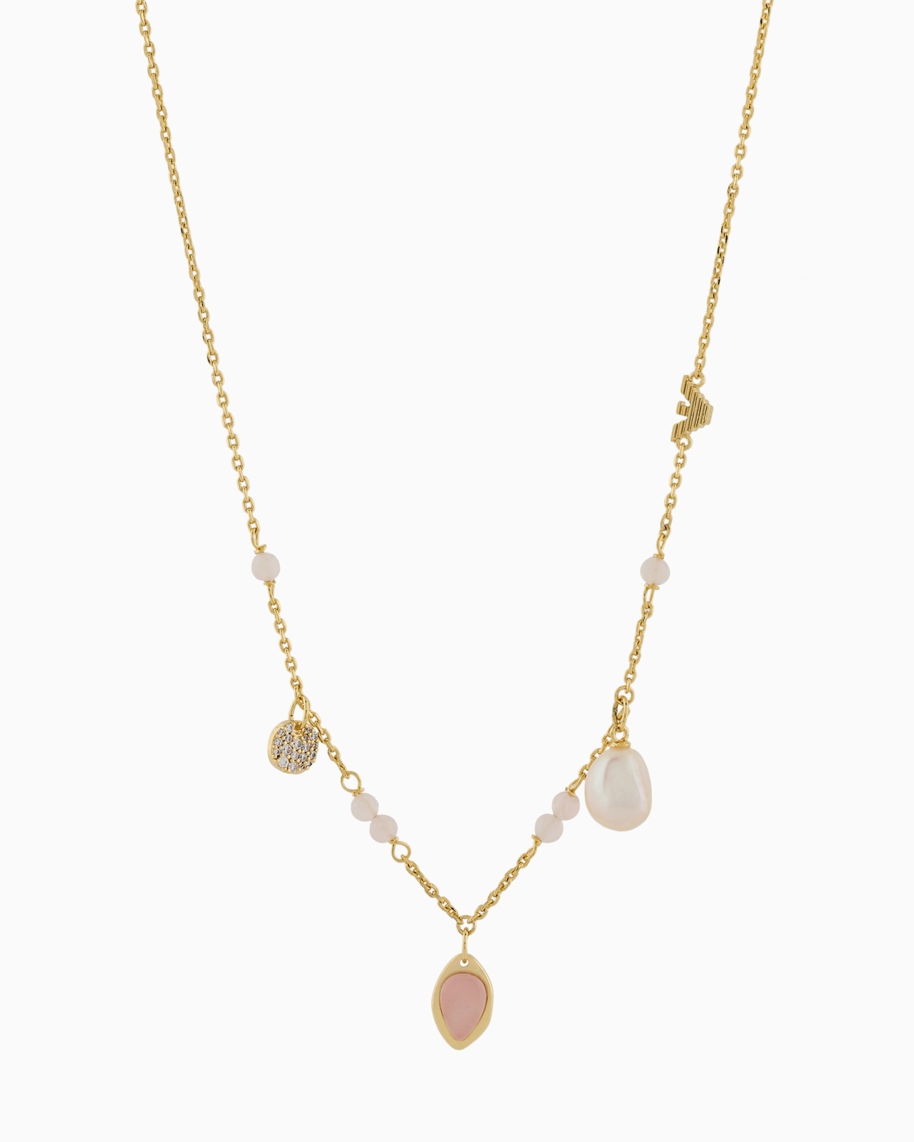 This station necklace features gold-tone brass, white cubic zirconia, white fresh water pearl, rose quartz stone and a lobster clasp closure. Necklace Station Brass Gold Length: 380mm+70mm, Width: 6.6mm, Height: 10.8mm Product Code: EGS3117710NLPNLC