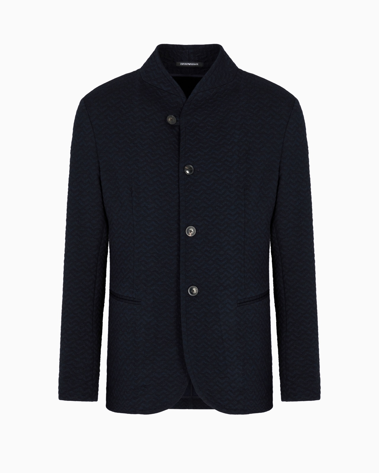 Jacket with guru collar made of a super compact jersey knit. The dense, sophisticated knit featuring the iconic chevron motif blends with the modern, linear design of the style. With Emporio Armani, the brand’s iconic garment becomes ever more modern and versatile, designed to express the spirit of the wearer. Jersey knit Chevron motif Guru collar Button closure Long sleeves Double-welt side pockets Lined garment Product Code: EM000352TE13968UB109