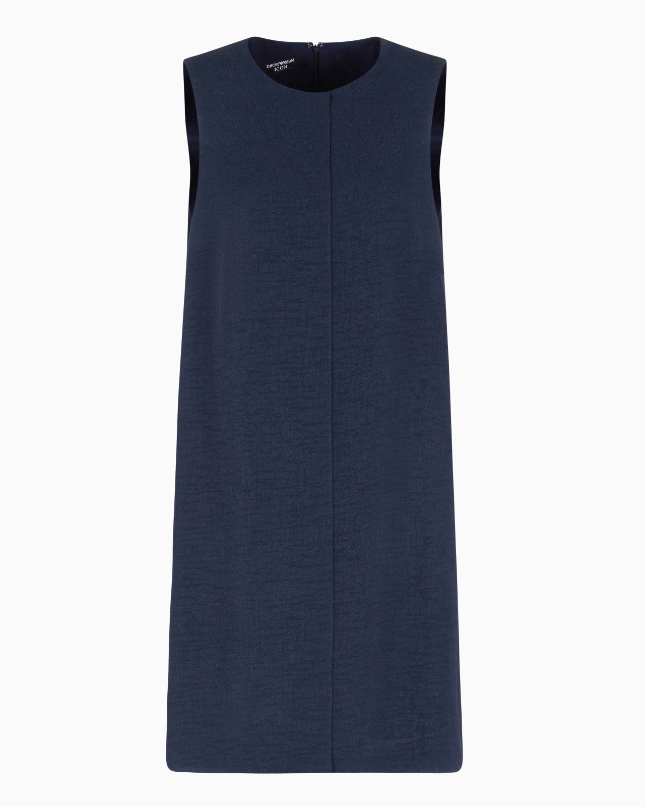 Sleeveless tunic dress with pockets and front panel, made of an acetate and viscose blend distinguished by a distinctive armure texture. This piece is part of the Icon capsule collection: the essence of Emporio Armani, providing a modern interpretation of the brand’s DNA by updating the iconic shapes and volumes of its past, aimed at affirming a classic, evergreen allure. Length: 90 cm Armure fabric Crew neck Sleeveless Front panel Back concealed zip Heavy georgette lining Product Code: EW000984TE12254OB003