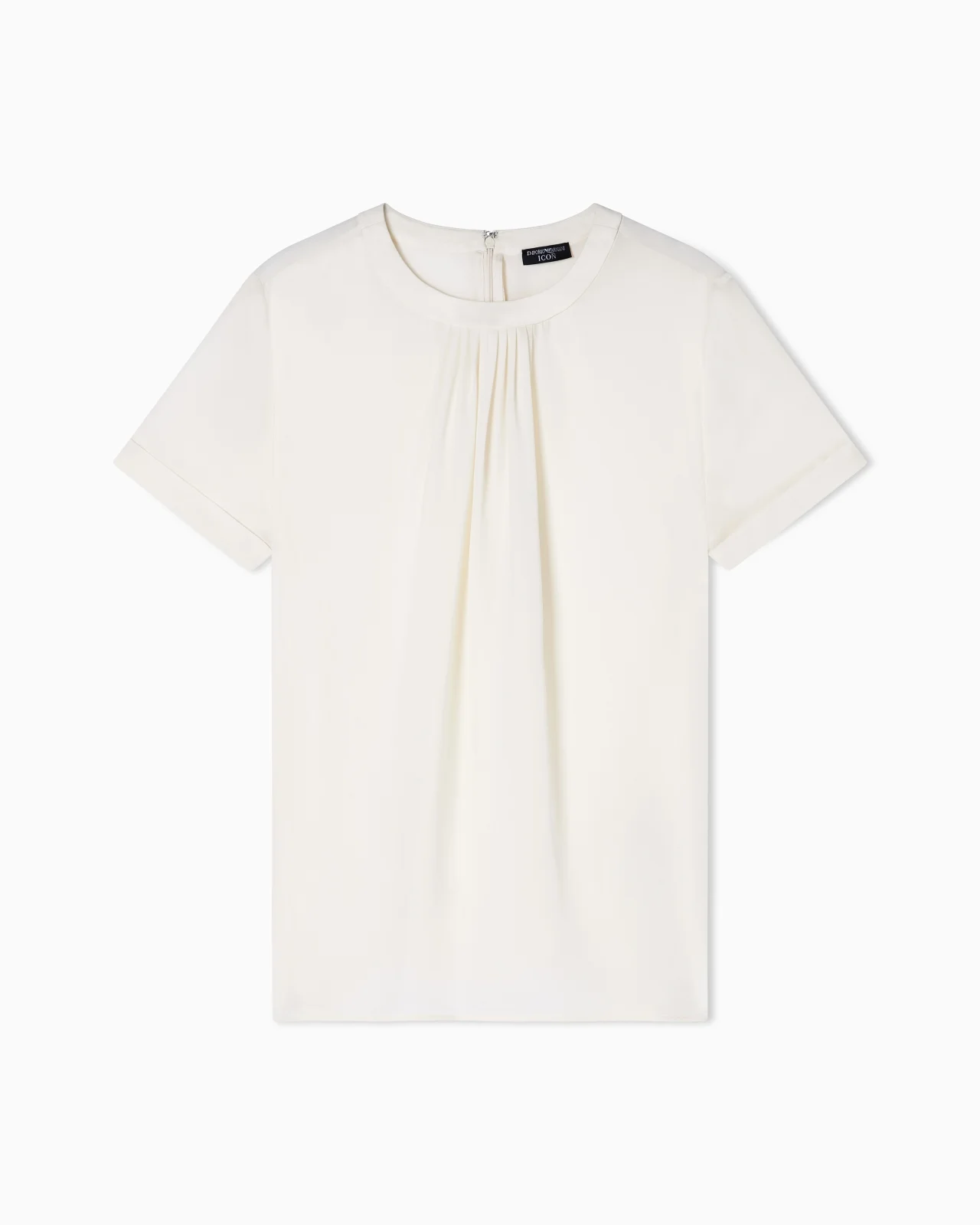 Round neck blouse characterized by a sophisticated pleat that decorates the front starting from the neckline. Thanks to the natural lightness of the pure silk georgette fabric, the model acquires femininity and vaporousness. The garment belongs to the Icon capsule. Silk georgette Crew neck Round neckline Decorative pleats Short sleeves Invisible zip on the back Unlined Product Code: EW003748TE10518U1055