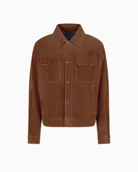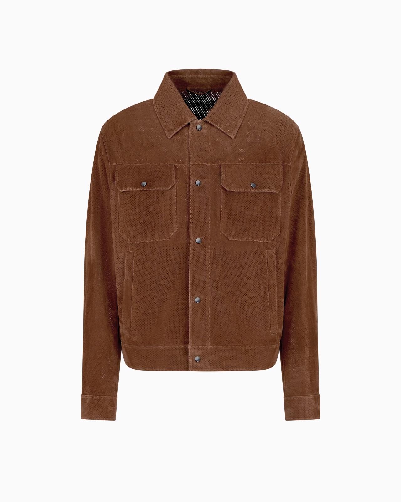 Jacket with press stud closure, made of supple suede crafted with all-over micro perforations. The Icon capsule collection dedicated to the Emporio Armani man makes a statement for the SS25 season with a selection that remains modern and up-to-date by reworking the brand’s iconic styles. Its exclusive 3D weave textures and typically Armani palette that ranges from cream, greige and hazelnut to the ubiquitous navy blue make the wardrobe instantly recognisable. Suede Perforated Classic collar Logo press-stud closure Patch pockets with flap and press stud closure Side pockets with press studs Long sleeves Straight cuffs with press studs Product Code: EM002003AF15662U6131