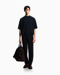 Knitted viscose-blend trousers with elasticated waist. The Icon capsule collection is dedicated to the Emporio Armani man and celebrates, season after season, the versatility and timeless elegance of the brand, reworking iconic clothing with a modern twist, in a perfect harmony of tradition and innovation. The FW25 selection is initially defined by fluid and airy silhouettes that play on blue and camel tones, then continues with a focus on exclusive knitwear distinguished by graphic designs and patterns with a strong visual impact. Knitted Ribbed elasticated waist Concealed zip closure Side pockets Back welt pocket Product Code: EM003779AF19235UB109