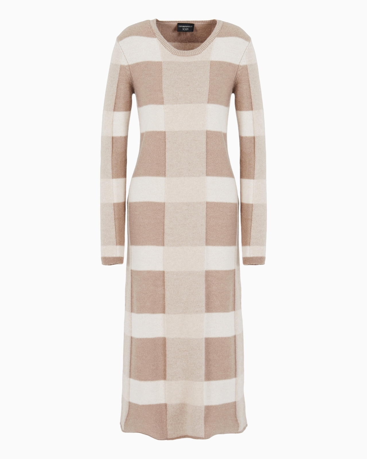 Long dress made from a virgin wool and cashmere blend. The plated-effect check pattern adds a distinctive touch. This piece is part of the Icon capsule collection: the essence of Emporio Armani, providing a modern interpretation of the brand’s DNA by updating the iconic shapes and volumes of its past, aimed at affirming a classic, evergreen allure. Product Code: EW000235AF107481F1015 Details Composition 90% Virgin Wool 10% Cashmere Length: 125 cm Knit Check motif Crew neck Long sleeves Fitting The model is 178 cm tall and is wearing size 40/S (Italian Size)