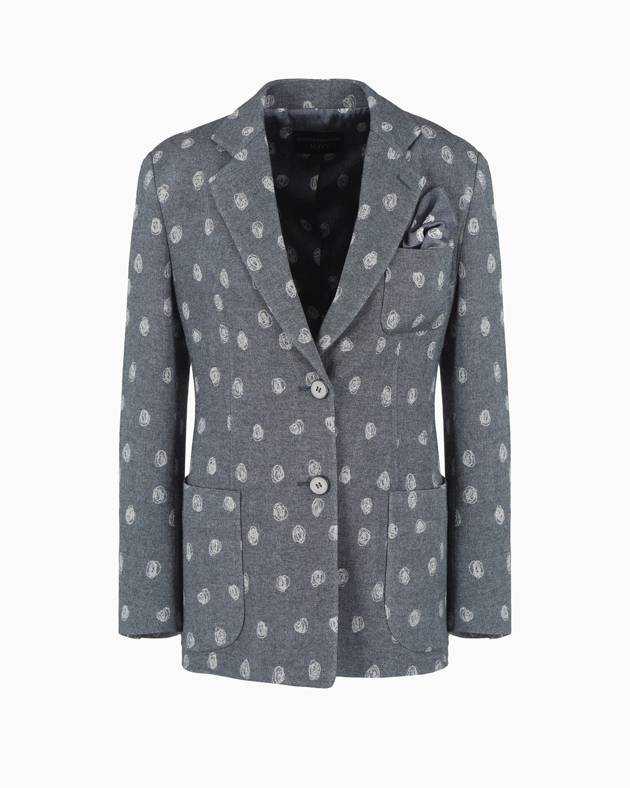 Single-breasted blazer made of a virgin wool blend embellished with an all-over collection pattern, an abstract motif that is also repeated in the satin pocket square and inner lining. The piece, with a convenient internal slip that can be detached using straps and press studs on the inside of the shoulders, is part of the Icon capsule collection: the essence of Emporio Armani, providing a modern interpretation of the brand’s DNA by updating the iconic shapes and volumes of its past, aimed at affirming a classic, evergreen allure. Product Code: EW000176TE105241O8003 Details Composition 46% Virgin Wool 36% Viscose 18% Polyamide All-over pattern Single-breasted Lapel collar Front buttoning Front patch pockets Printed satin pocket square included Long sleeves Button cuffs Back centre vent Printed satin lining Fitting The model is 178 cm tall and is wearing size 40/S (Italian Size)