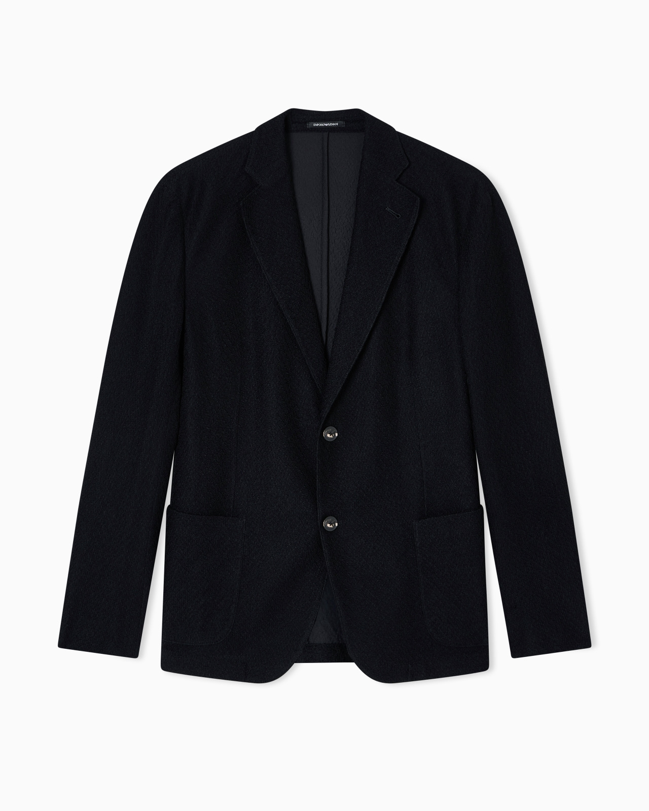 Single-breasted jacket with lapel neckline. The garment features the signature chevron motif over the entire item, lending a knitwear effect to the weave. The Icon capsule collection is dedicated to the Emporio Armani man and celebrates, season after season, the versatility and timeless elegance of the brand, reworking iconic clothing with a modern twist, in a perfect harmony of tradition and innovation. The FW25 selection is initially defined by fluid and airy silhouettes that play on blue and camel tones, then continues with a focus on exclusive knitwear distinguished by graphic designs and patterns with a strong visual impact. Chevron motif Knit effect Single-breasted Lapel collar Two-button closure Long sleeves Side patch pockets Lining only on sleeves Product Code: EM000437AF19382UC001