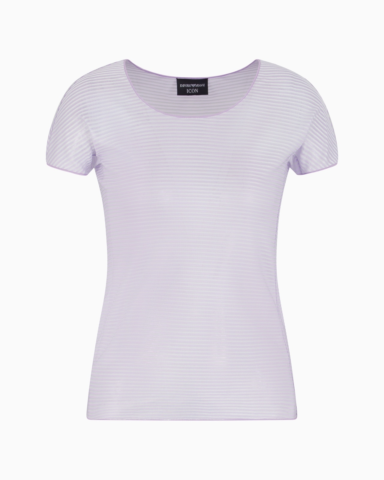 Round-neck jumper made of lightweight viscose jersey, covered in a classic horizontal striped motif with a rib-effect texture. This piece is part of the Icon capsule collection: the essence of Emporio Armani, providing a modern interpretation of the brand’s DNA by updating the iconic shapes and volumes of its past, aimed at affirming a classic, evergreen allure. Jersey Striped design Rounded neckline Short sleeves Product Code: EW001129AF13320F8034