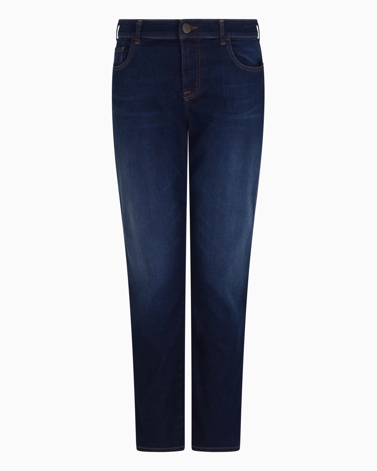 The modern style of these jeans, made of a stretch cotton and Lyocell blend denim, is enhanced by the mid-rise waist and slim, straight leg. Emporio Armani jeans are an undisputed choice in terms of style, perfect for showing off on any occasion. Slim fit. Slim fit Mid-rise waist with belt loops Five pockets Straight cut Zip and button closure Suede jacron with logo Laser-cut logo on the back Product Code: EW001499AF12677MB001