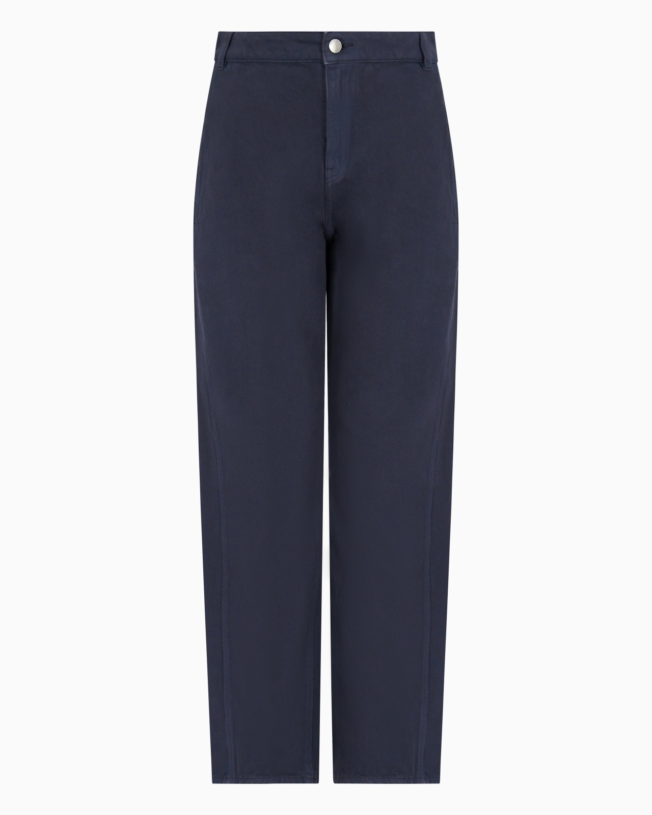 Modern, mid-rise, oval-leg jeans made from pure cotton drill with a garment-dyed treatment. Drill is a very sturdy woven fabric, featuring small visible ribs and similar to denim in terms of weight and durability. This piece is part of the Icon capsule collection: the essence of Emporio Armani, providing a modern interpretation of the brand’s DNA by updating the iconic shapes and volumes of its past, aimed at affirming a classic, evergreen allure. Drill Waist with belt loops Zip and button closure Side pockets Back patch pockets Mirco back eagle plate Product Code: EW001036AF12444UB115