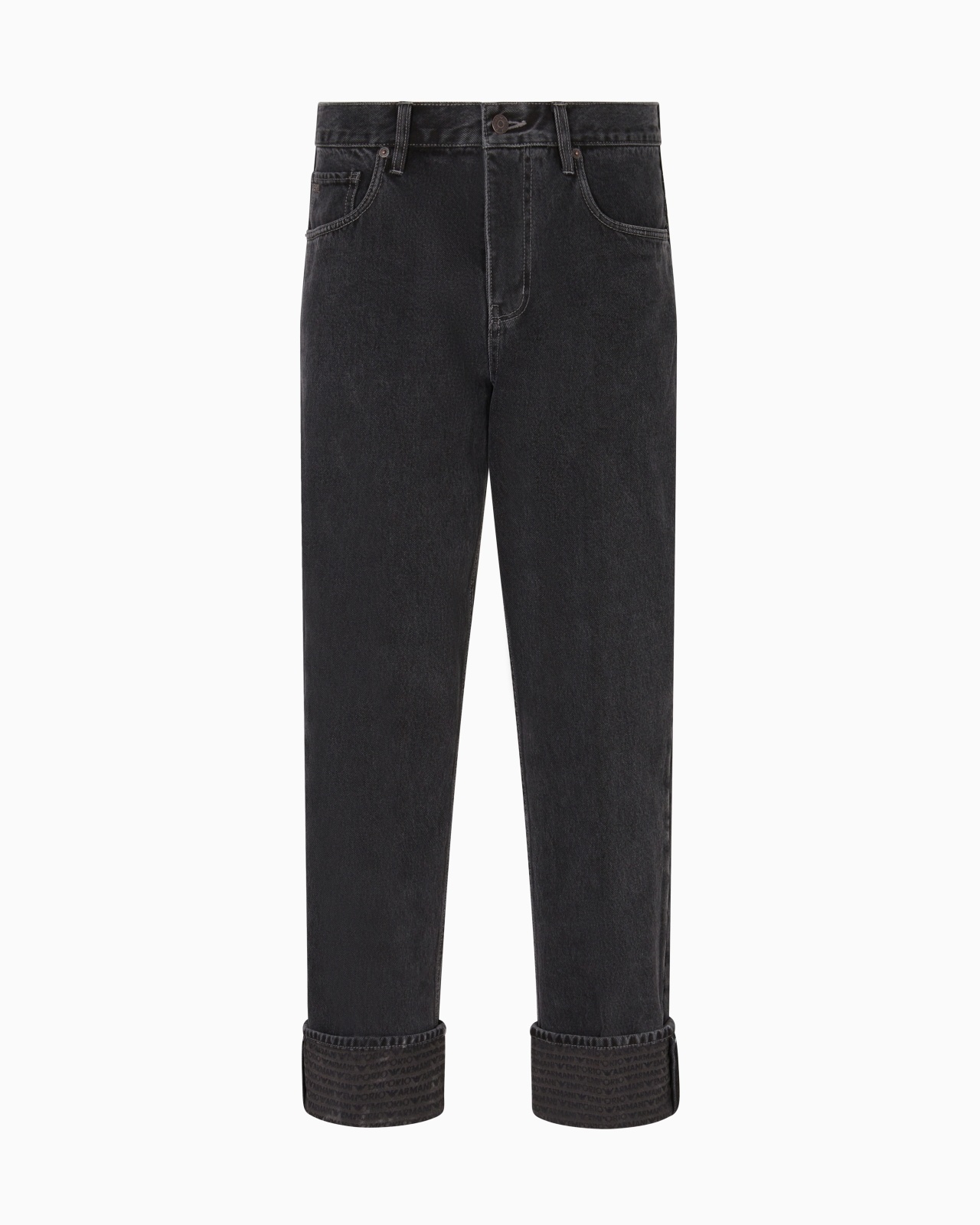 Mid-rise jeans with a narrow leg, low crotch and zip fly. Made of pure cotton denim and featuring a deep, fixed turn-up on the hem, distinguished by an all-over Emporio Armani logo jacquard. Loose fit. Loose fit Denim Five-pocket style Regular waist with loops Zip and button closure Fixed turn-up with logo Leather logo patch on the back Product Code: EM000664AF17812M8001