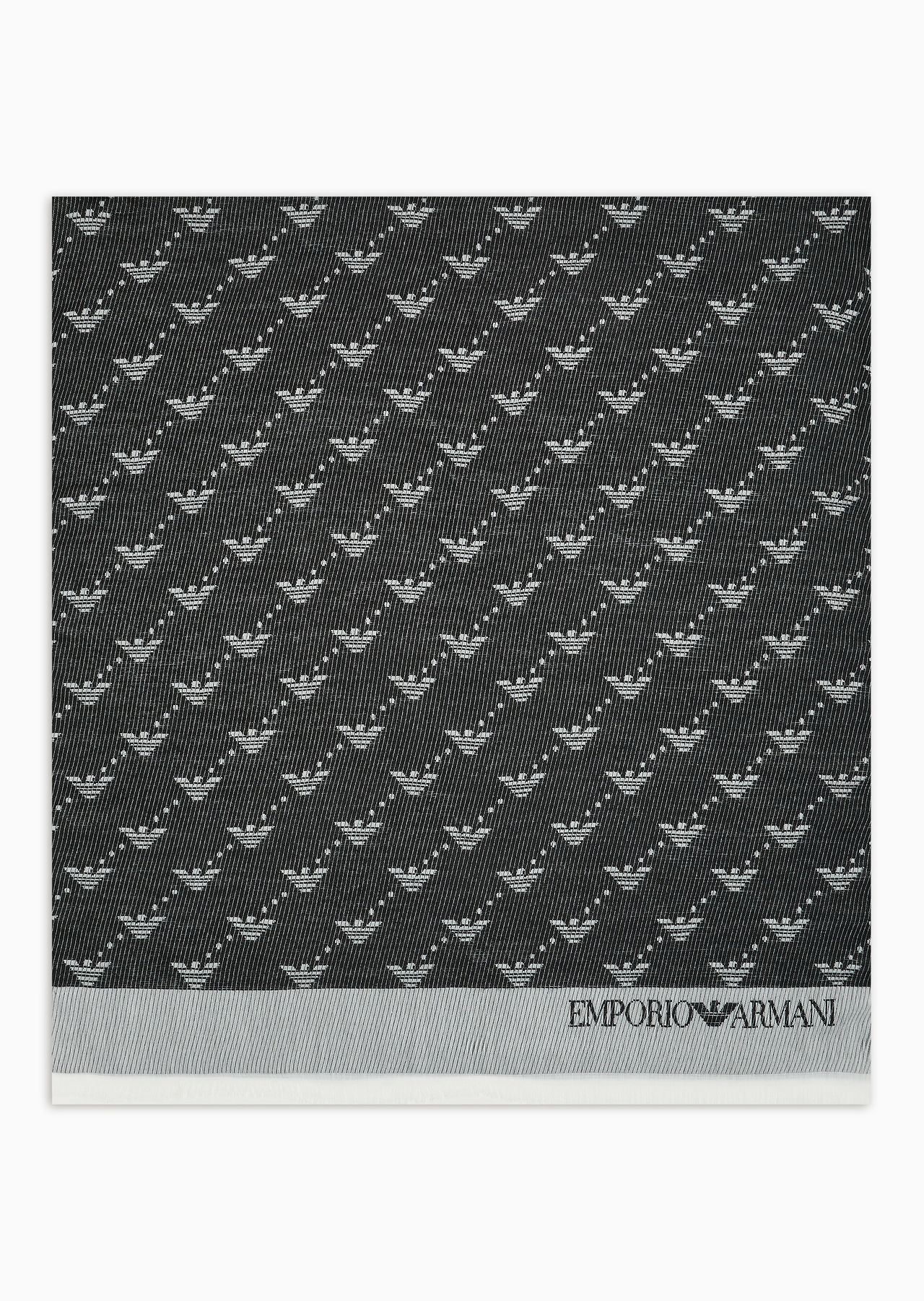 Stole made of jacquard-weave fabric, with all-over iconic eagles and Emporio Armani logo on the left hem. Product Code: 6252094F310100020 Details Composition 60% Polyester 40% Acrylic Measurements: 190 x 85 cm Jacquard All-over eagle design Fringed trim Made in Italy