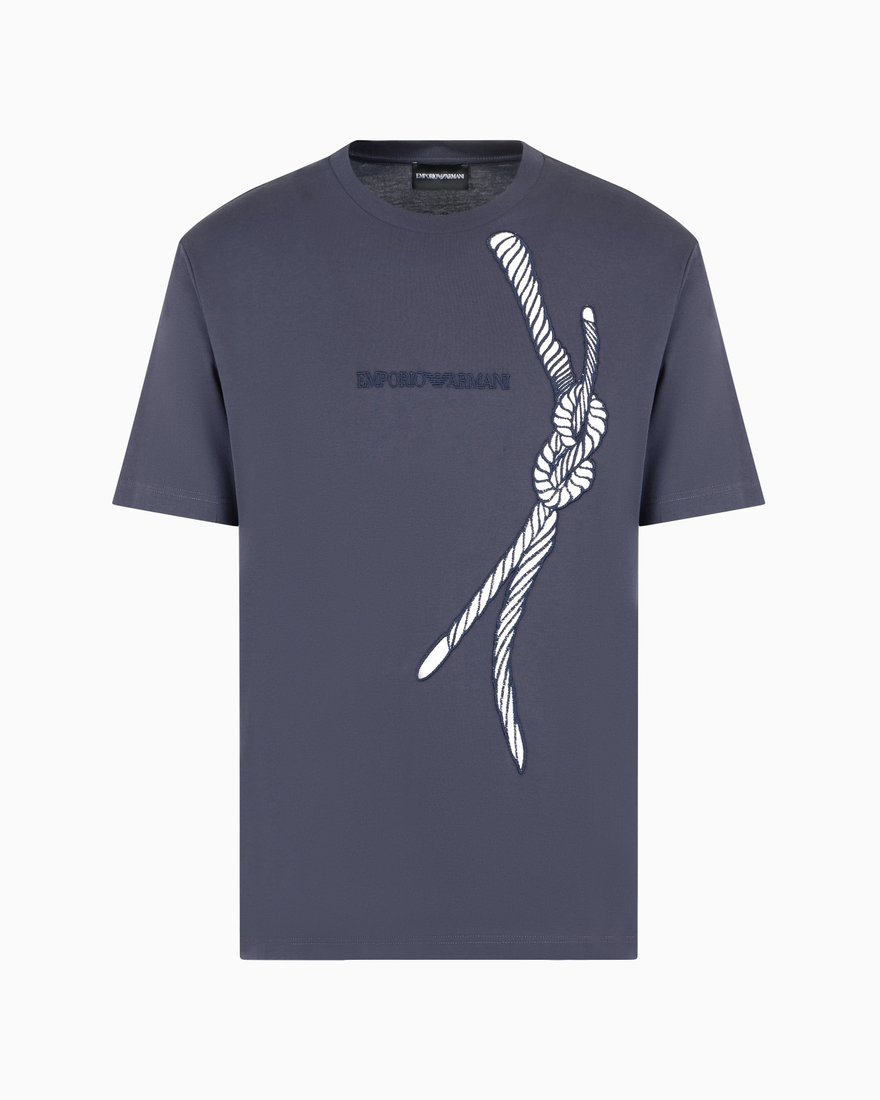 Crew-neck T-shirt in pure cotton jersey, featuring a logo and original front embroidery depicting a rope, a traditional maritime element, which embellishes the front of the piece and reveals a cosy velvet interior. By choosing this product you are helping to support the Better Cotton Initiative: The BCI uses a tracking system that allows Better Cotton to replace or be blended with conventional cotton. Product Code: 6D1T6U1J7FZ10935 Details Composition 100% Cotton Jersey Crew neck Short sleeves Collection embroidery Embroidered logo Velvet for embroidery Fitting The model is 188 cm tall and is wearing size 48/M (Italian Size)