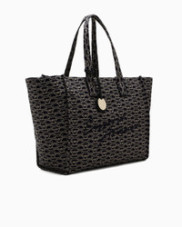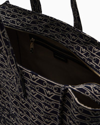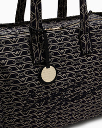 Oversized shopper bag with double handle and logo charm. A series of accessories featuring a dense all-over monogram jacquard, available in functional styles designed for the Emporio Armani woman always on the go. Measurements: 64.5 x 21 x 34.5 cm Jacquard canvas All-over monogram Two handles Logo charm Logo embroidery Zip closure Product Code: EW000561AF12993FB237