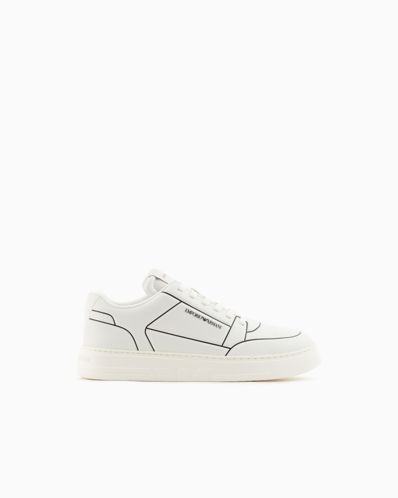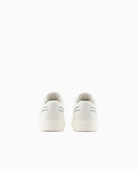 Calfskin sneakers with a contrasting logo side detail and exclusive embossed print that creates a grid design along the entire upper. The front of the tongue and back tab always have a screen-printed Emporio Armani logo. Clean-lines and comfort define these sneakers with their essential design that echoes 90s-style basketball footwear. Leather Printed design Visible logo Lace-ups Rounded toe Rubber soles Product Code: EM002852AF18014M0017