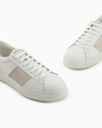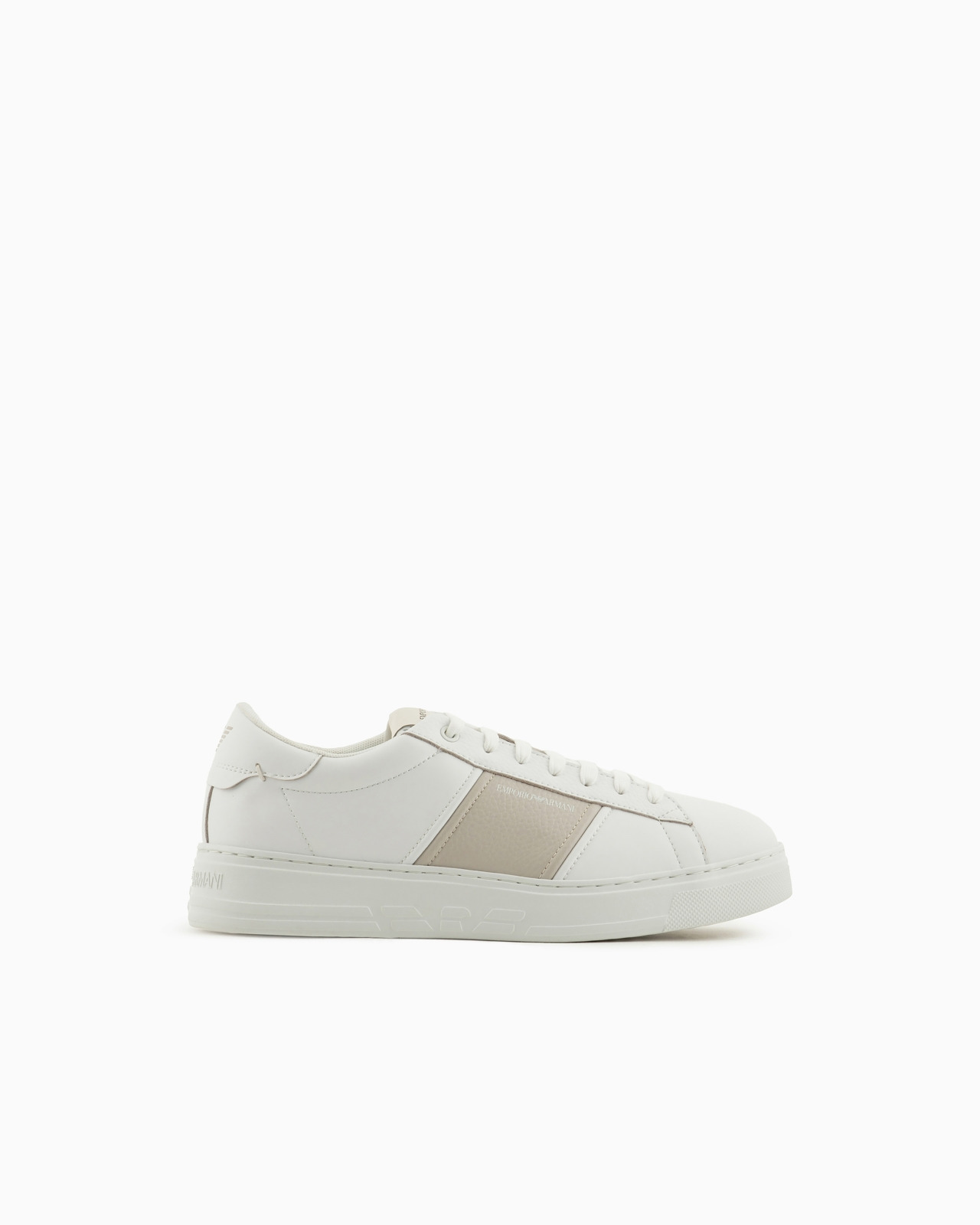 Calfskin sneakers with contrasting side logo detail. The front of the tongue and back tab have a screen-printed Emporio Armani logo and eagle motif. Clean-lines and comfort define these sneakers with their essential design that echoes 90s-style basketball footwear. Product Code: X4X570XN8401T850 Details Composition 100% Bovine leather Leather Visible logo Lace-ups Rounded toe Rubber soles