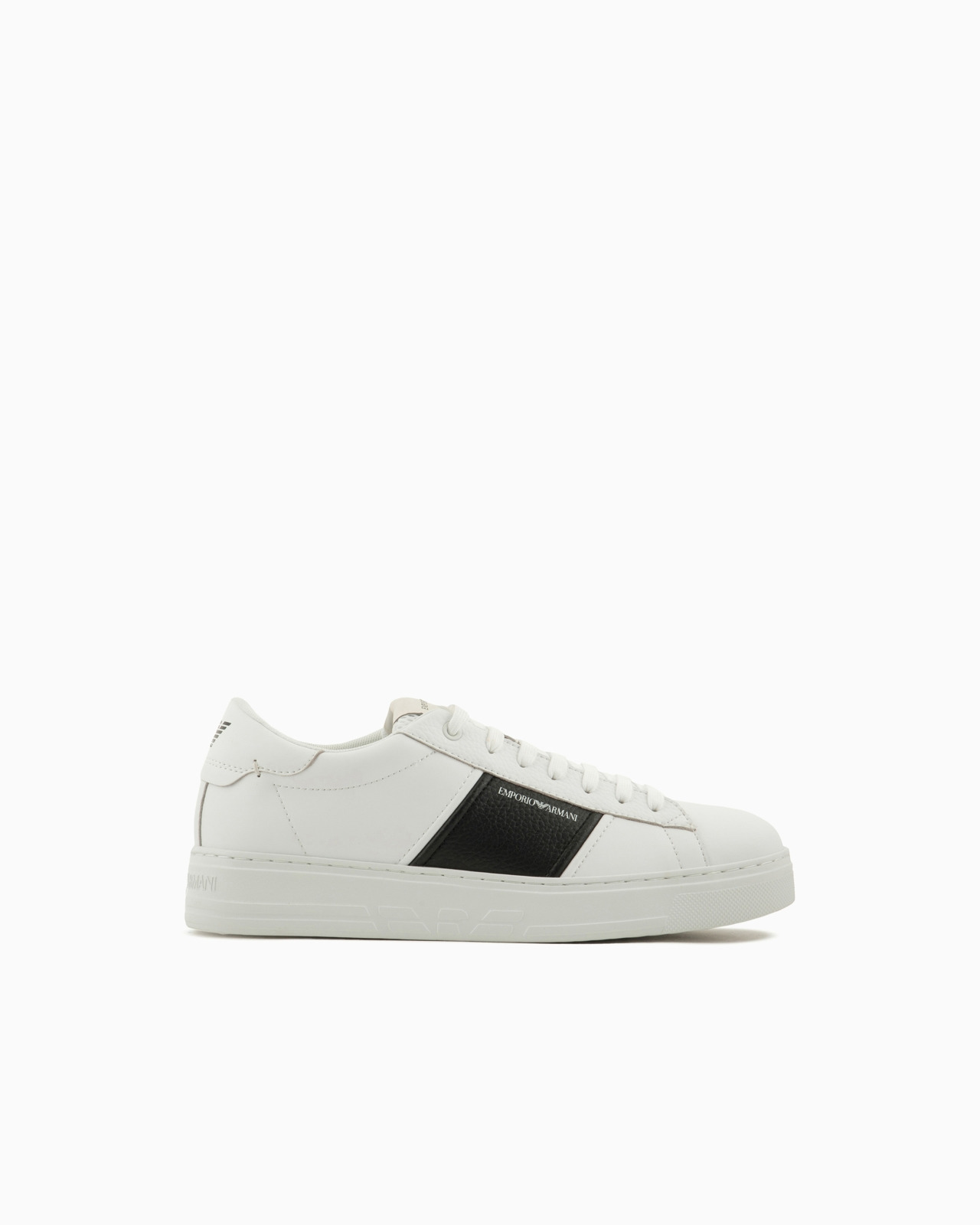 Calfskin sneakers with contrasting side logo detail. The front of the tongue and back tab have a screen-printed Emporio Armani logo and eagle motif. Clean-lines and comfort define these sneakers with their essential design that echoes 90s-style basketball footwear. Product Code: X4X570XN8401K488 Details Composition 100% Bovine leather Leather Visible logo Lace-ups Rounded toe Rubber soles