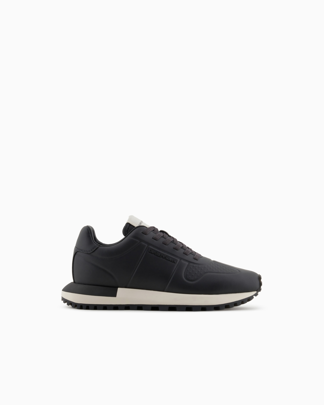 Sneakers made from recycled leather with side logo that adds distinction, and embossed thermoformed details. The customised running shoe sole is made of recycled EVA with non-slip tread. Sophisticated in style and deeply inspired by traditional running sneakers, they are versatile and suitable for even the most elegant occasions. Leather Side logo Lace-ups Rounded toe Rubber soles Product Code: X4X684XR32300002