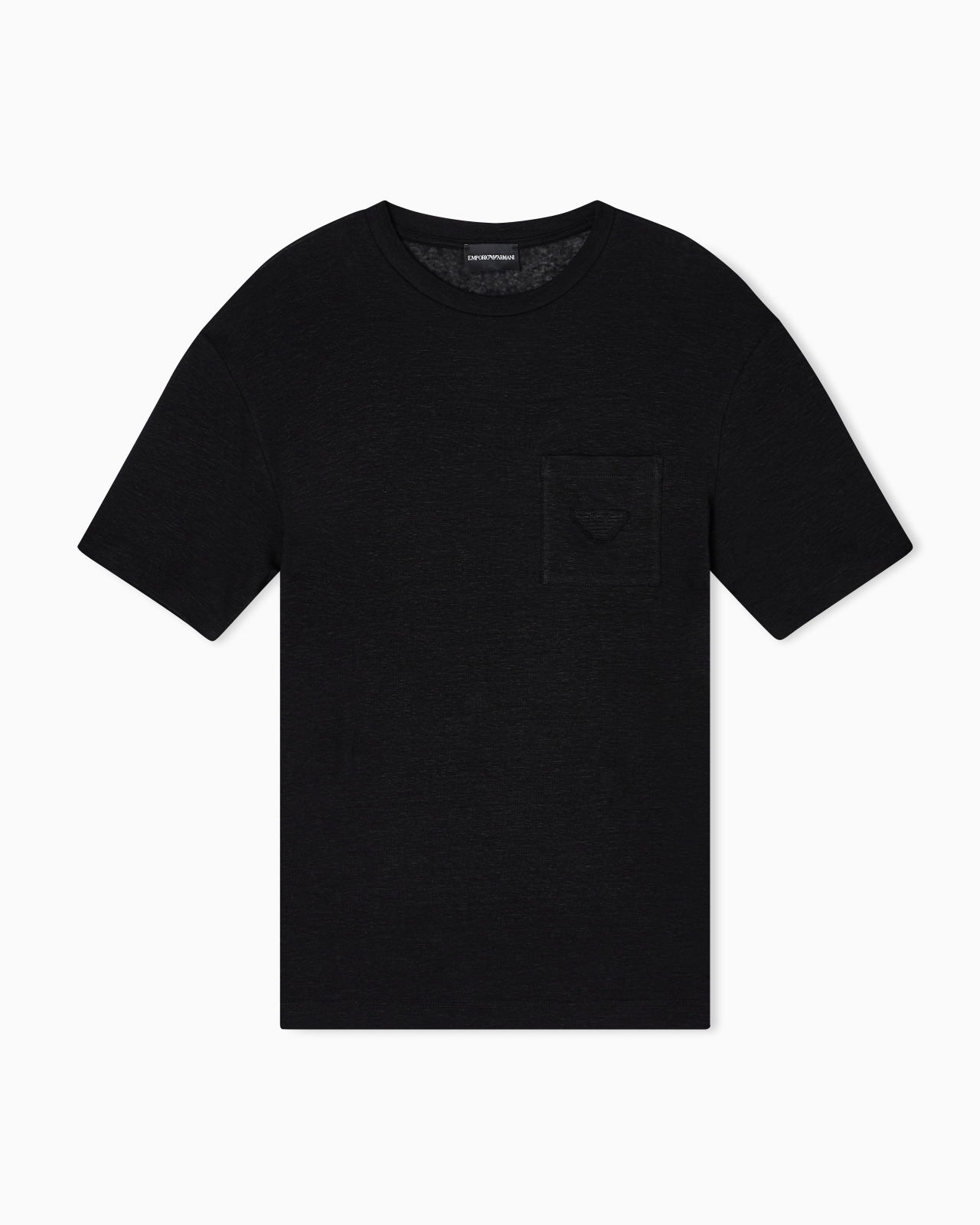 Crew-neck T-shirt made from linen jersey, with a slightly sheer weave thanks to the brushed-effect finish. A fresh and comfortable item, with a patch pocket on the chest embellished by a matching embroidered eagle logo patch. Jersey Crew neck Short sleeves Patch pocket Eagle embroidery patch Product Code: EM002818AF17962UC001