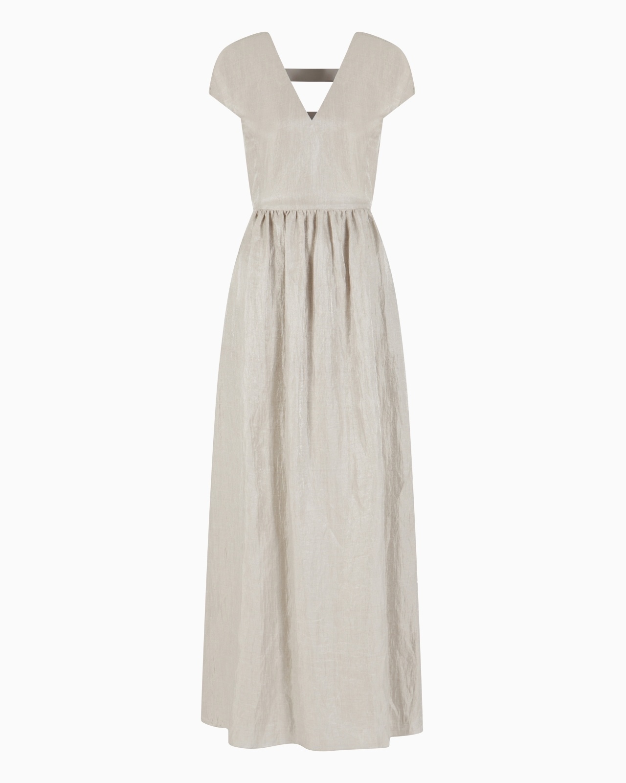 Long dress with a V neck, short sleeves and two practical side pockets, made of crisp linen with a shiny finish that adds a natural sheen to the piece. Dress with a feminine design and fluid texture that your can wear effortlessly from day to night: the skirt with pleats that create movement and a signature cut-out neckline at the back elevate the sophisticated nature of the style. Length: 145 cm Linen V neck Short sleeves Side pockets Skirt with darts and pleats Invisible side zip fastening Back V neck Grosgrain cut-out detail Elasticated back waist Unlined garment Product Code: EW001744TE14311U8011