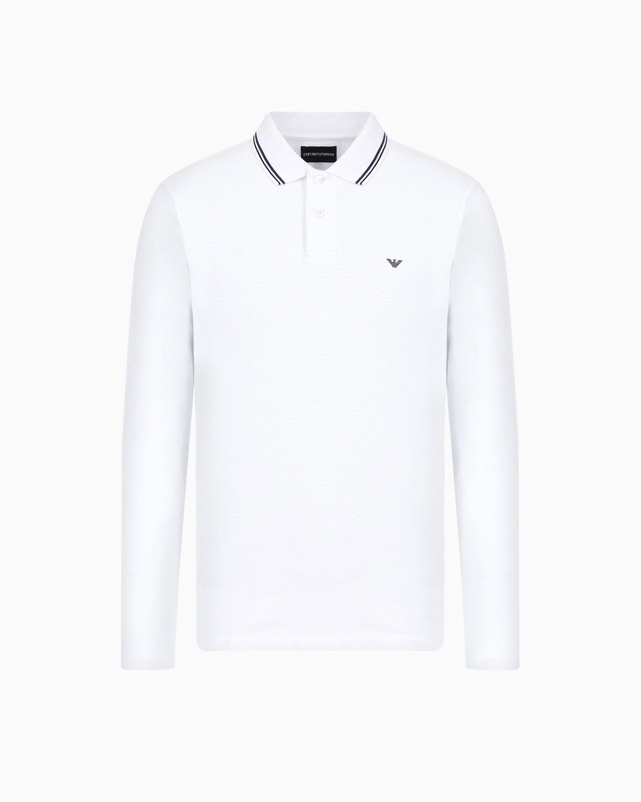 Long-sleeved polo shirt in a fresh, draped pique fabric that adds understated elegance to the item. Embroidered micro eagle on the chest and contrasting striped inserts on the collar. This item belongs to the Essentials clothing selection, the Emporio Armani capsule collection that is an evergreen statement of style: an ongoing collection with clean, well-designed shapes for a wardrobe that meets the demands of any season. These “essential”, versatile pieces are a must-have for the male wardrobe. Product Code: 8N1FB51JPTZ10100 Details Composition 96% Cotton 4% Elastane Pique Polo-shirt collar Partial closure with buttons Long sleeves Eagle embroidery on the chest Side slits at the hem Fitting The model is 188 cm tall and is wearing size 48/M (Italian Size)