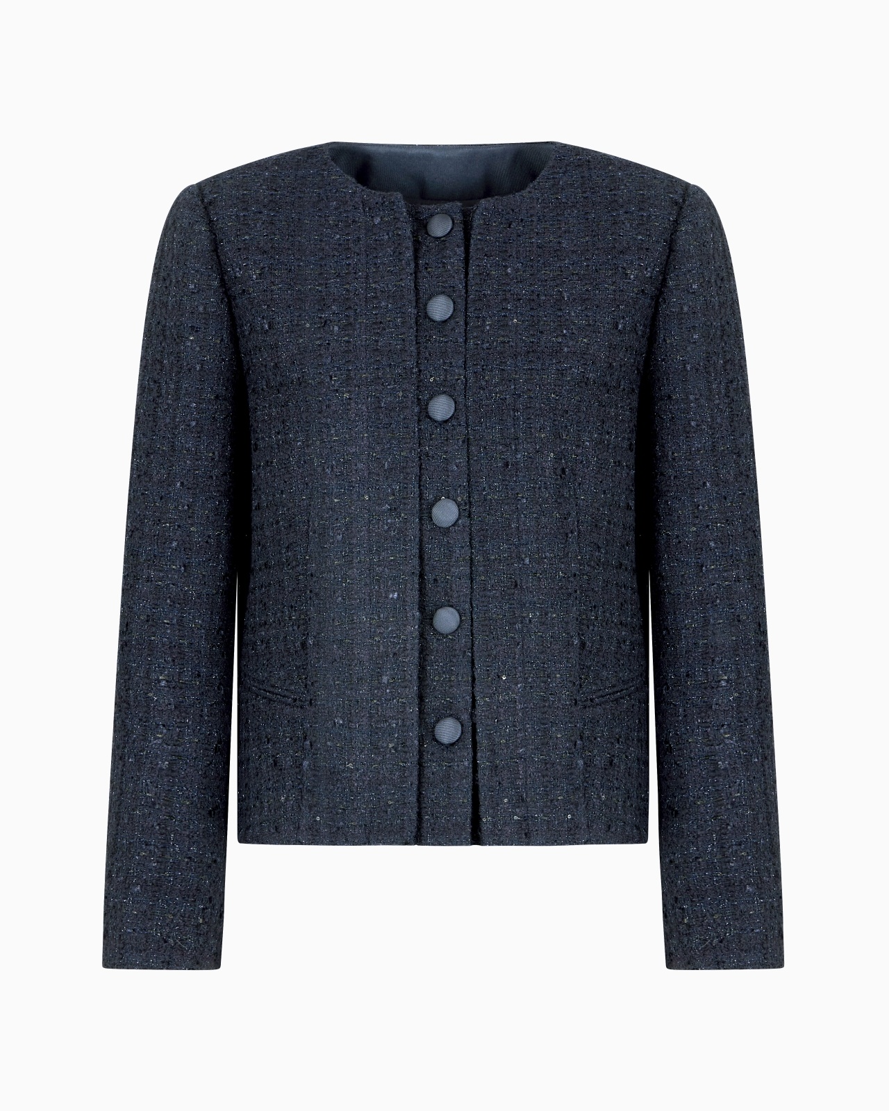 Jacket with matching ottoman-covered buttons, made of lurex tweed, a textured fabric that, thanks to the mix of filaments, takes on a sophisticated interwoven effect that enhances the exclusiveness of the piece and ensures sparkle and radiance Lurex tweed Crew neck Grosgrain-covered buttons Long sleeves Button cuffs Double-welt side pockets Grosgrain interior trim Lined garment Product Code: EW000860AF12520UB115